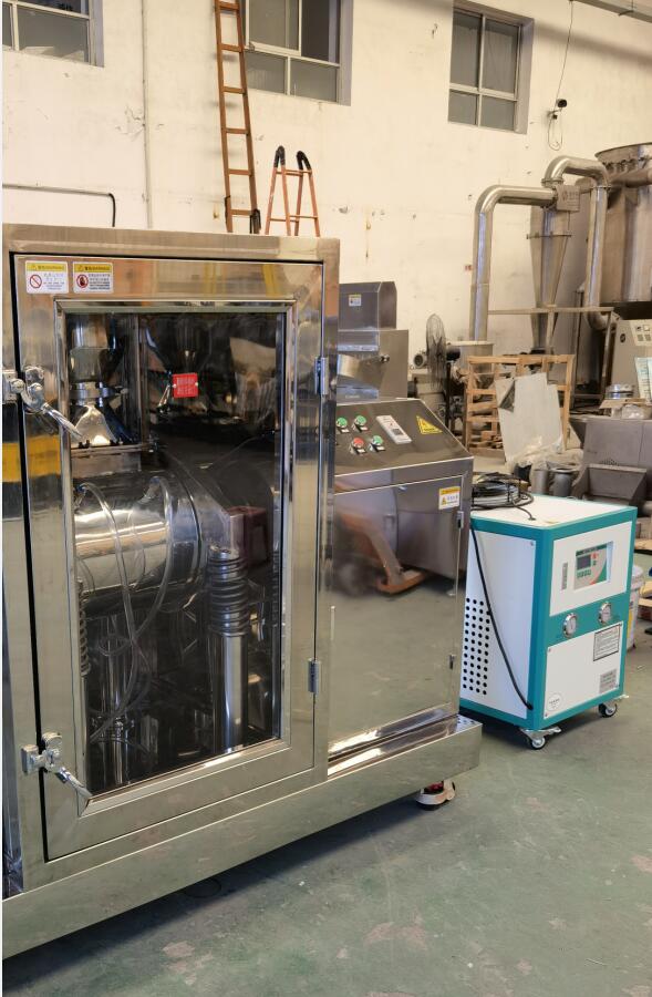 無環境污染。 細胞破壁機系列設備具有以下特征 1、安全性強:與物料接觸的部位均為拋光不銹鋼,其材質為國際醫藥食品機械通用材質(也可根據用戶要求改為其它金屬材質)。 2、潔凈衛生:內外面平滑、一機多用、減少污染、減輕洗凈作業負擔;粉碎過程全密閉無粉塵溢出,充分改善作業環境,有效成份不損失。 3、采用復合(透明)隔聲罩,具有降噪功能。 4、易拆卸(組裝)、易清洗、易換料。可用水、壓縮空氣、酒精、蒸汽等清洗、消毒。 5、操作簡便:容量適配、確保物料完全排出,操作和換料簡便。 6、維護方便:結構緊湊、占地面積小,維修養護方便。 7、改善環境:全密閉作業無粉塵溢出、有效成份不損失、無藥渣產生,可改善工作環境。 8、提高效率:高速撞擊力和剪切力的雙向作用,極大地縮短了粉碎時間,提高粉碎效率。 9、廣譜適應:對于任何纖維狀、高韌性、高硬度或有一定含水率的物料均可適應。對花粉及其它孢子植物等要求打破細胞壁的物料,其破壁率高于95%。同時適應干式和濕式粉碎。濕式粉碎時可加入水、酒精或其它液體。 10、溫度可控:通過配置可進行高溫、常溫、低溫或超低溫的微粉碎,可以保持物料的原有理化性質和活性成份。給磨筒外壁的夾套通入冷水。通過調節冷卻水的溫度和流量可控制粉碎溫度。低溫粉碎,冷凍系統最低溫度可達零下35℃(高檔低溫配置)。[冷凍系統另外購買,標配為水冷降溫。]